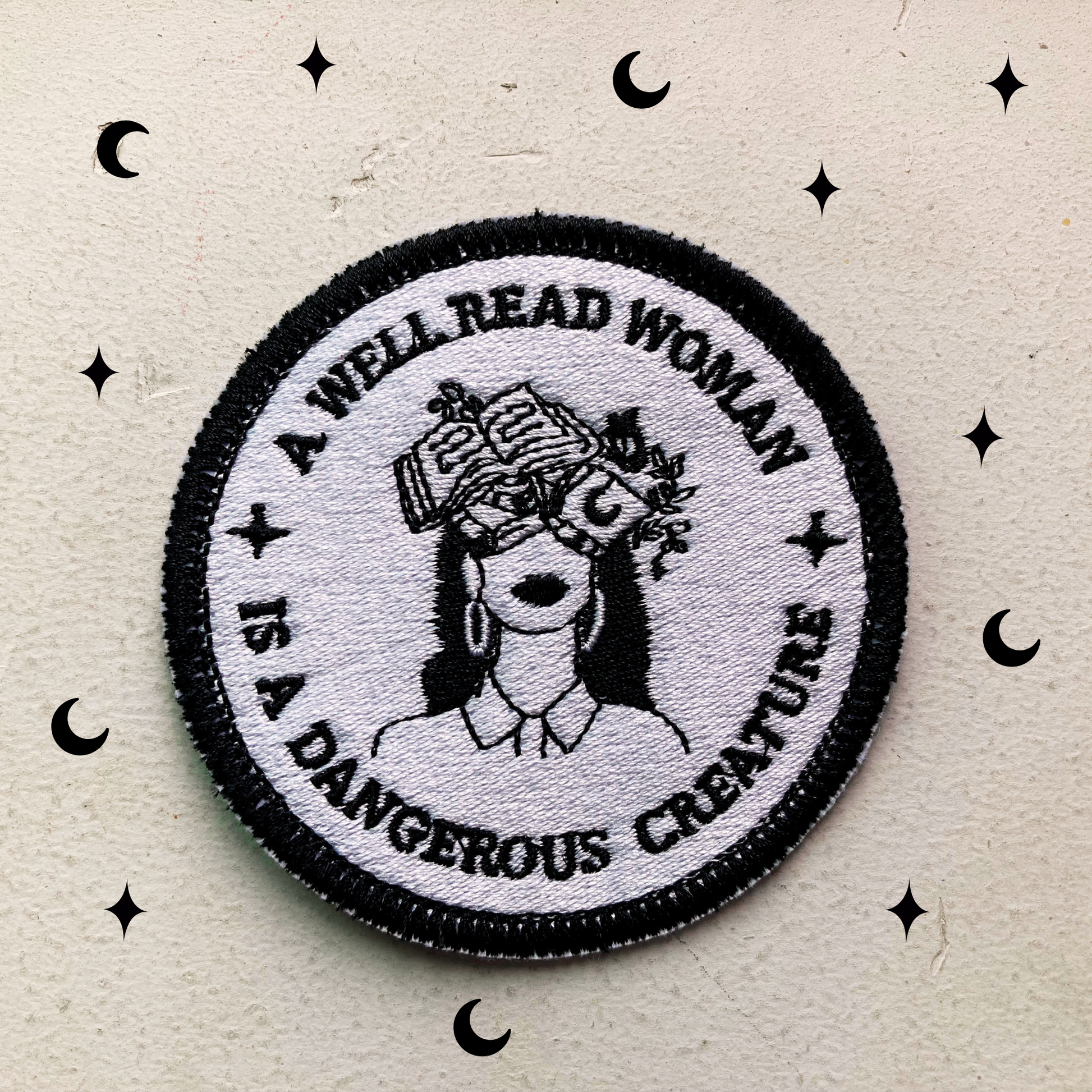 She’s not just a reader — she’s a force to be reckoned with. This fully embroidered patch features the outline of a woman whose face is hidden by open, floating books filled with mystical detail — a visual reminder that knowledge, imagination, and power are her armor.