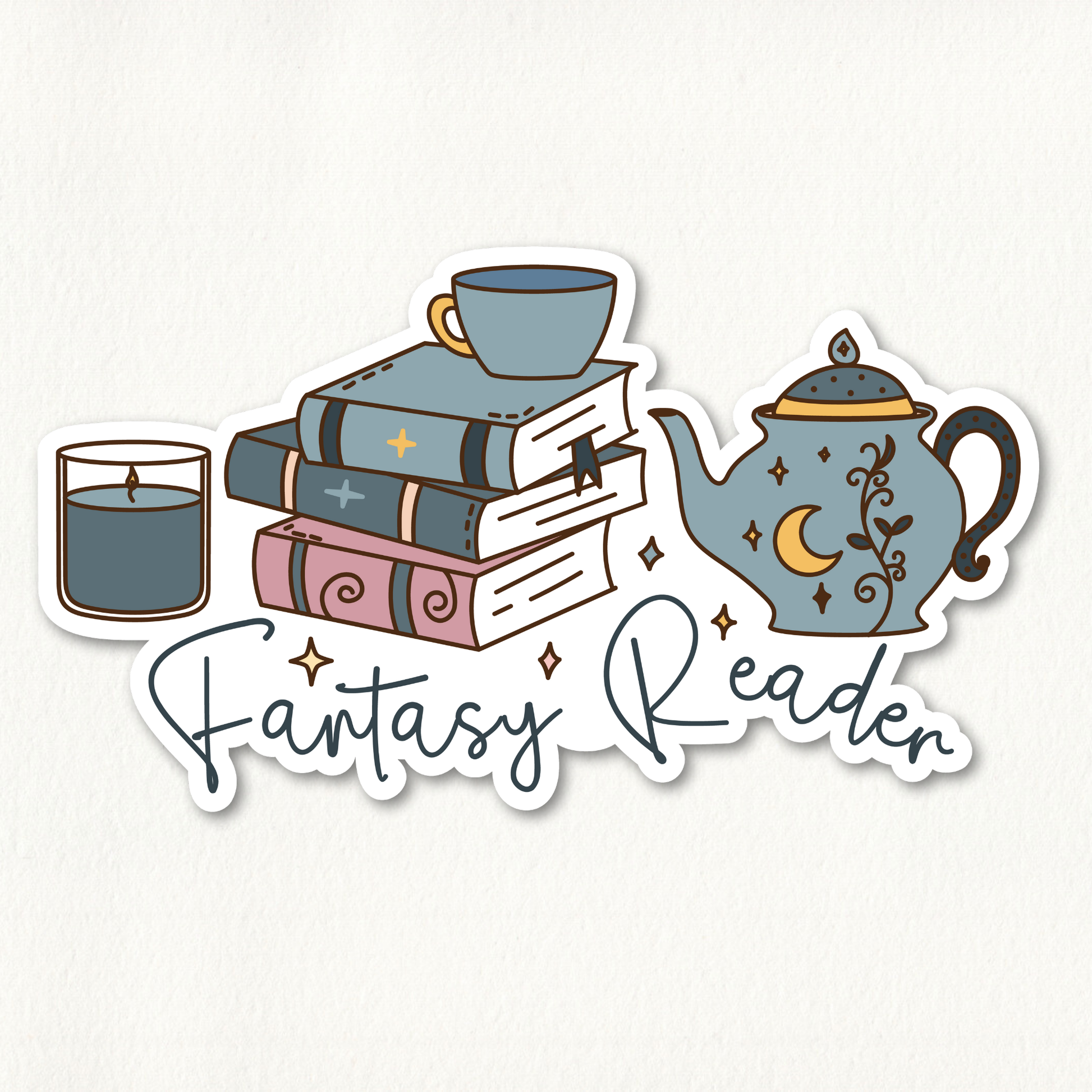 A cozy vinyl sticker designed for fantasy lovers, featuring a stack of books with a teacup on top, a moon-and-star decorated teapot, a lit candle, and the phrase “Fantasy Reader” in a flowing script. Made from high-quality, weatherproof vinyl with a matte finish.