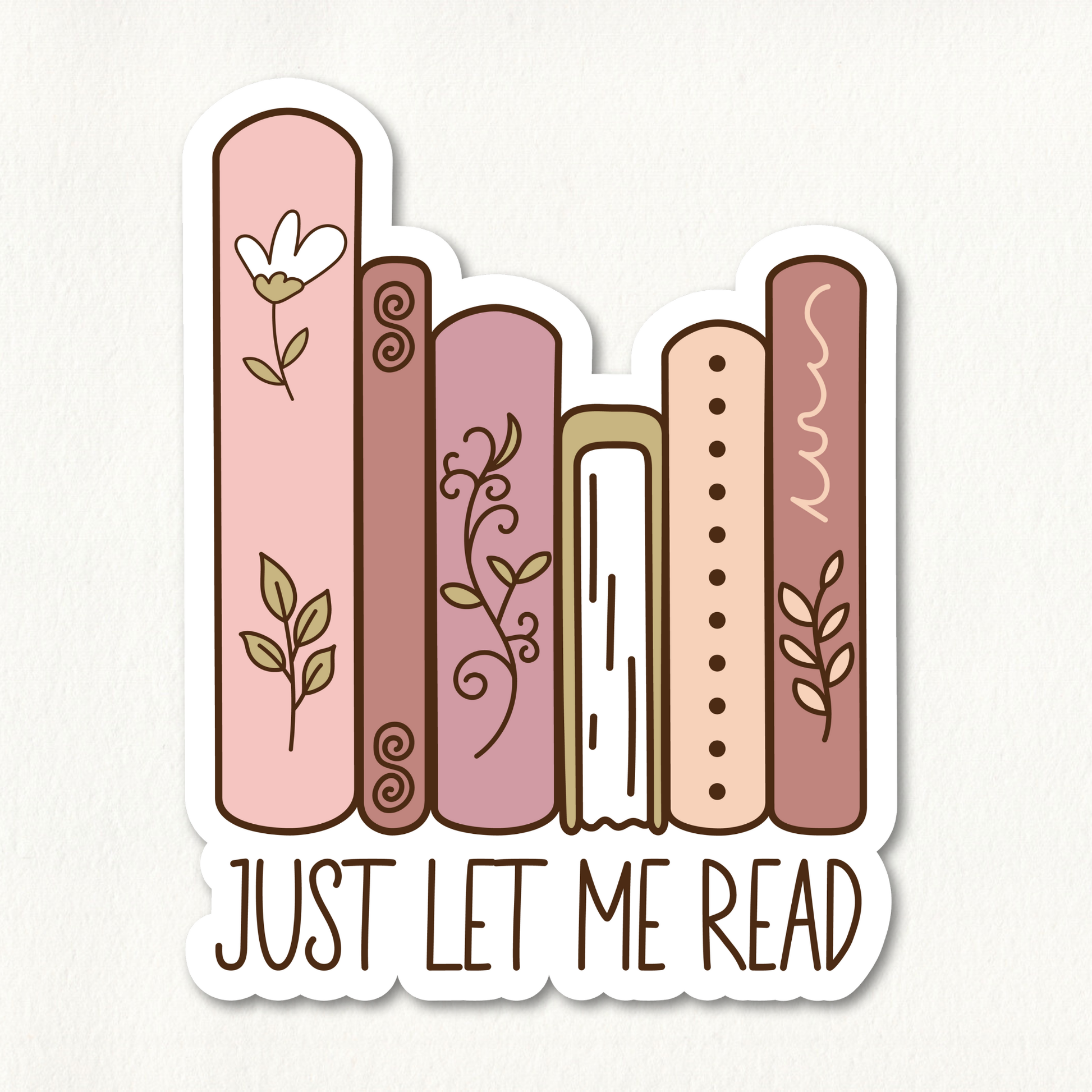 This vinyl sticker features a row of pastel-colored books with floral and abstract designs, paired with the phrase “Just Let Me Read” underneath. Made from durable matte vinyl that’s resistant to water, scratching, and fading.
