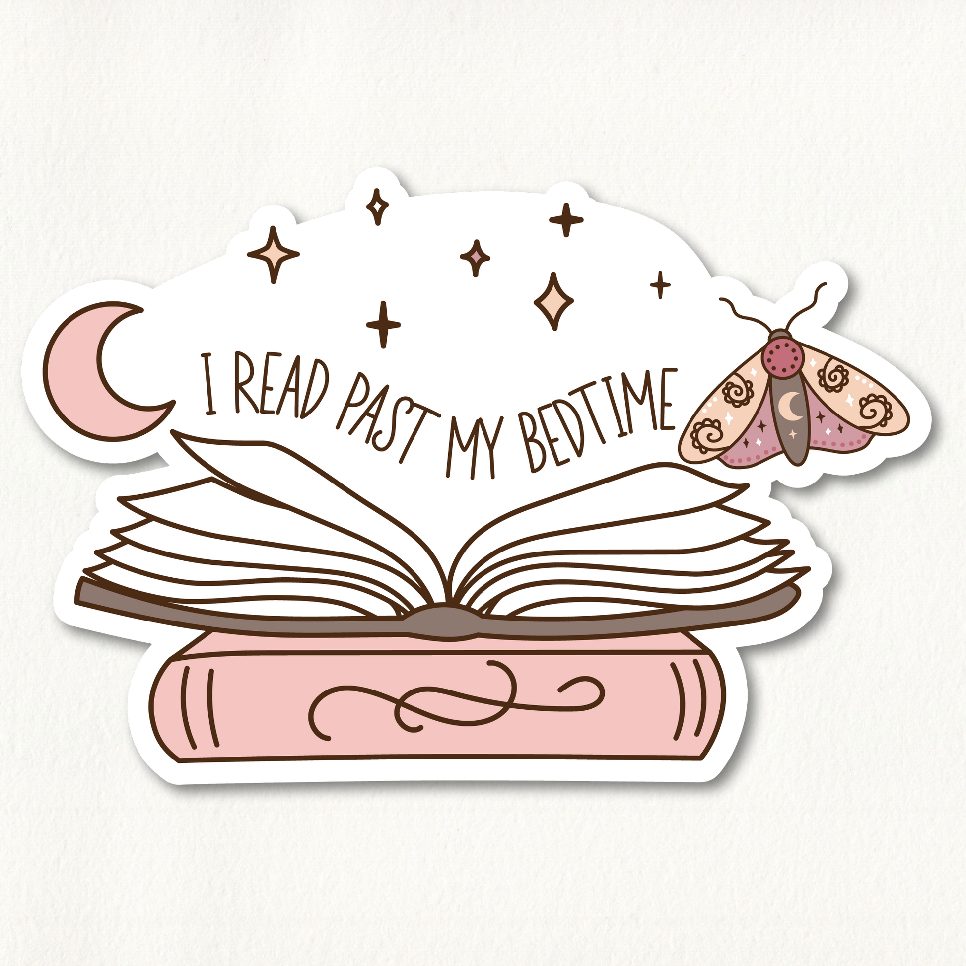 This durable vinyl sticker features an open book with the phrase “I Read Past My Bedtime,” surrounded by a crescent moon, stars, and a stylized moth. Printed on weatherproof, scratch-resistant material with a matte finish, it’s perfect for decorating laptops, water bottles, notebooks, or Kindles.
