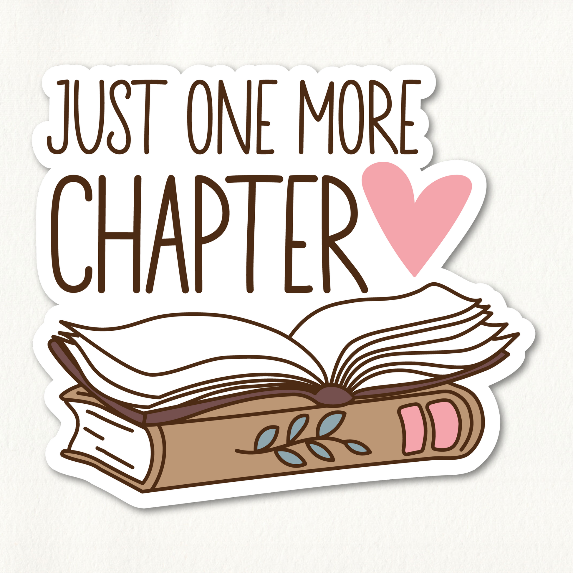 This vinyl sticker features an open book resting on a decorative spine, with the phrase “Just One More Chapter” and a pink heart. Printed on durable, waterproof matte vinyl, perfect for readers who can’t put the book down.