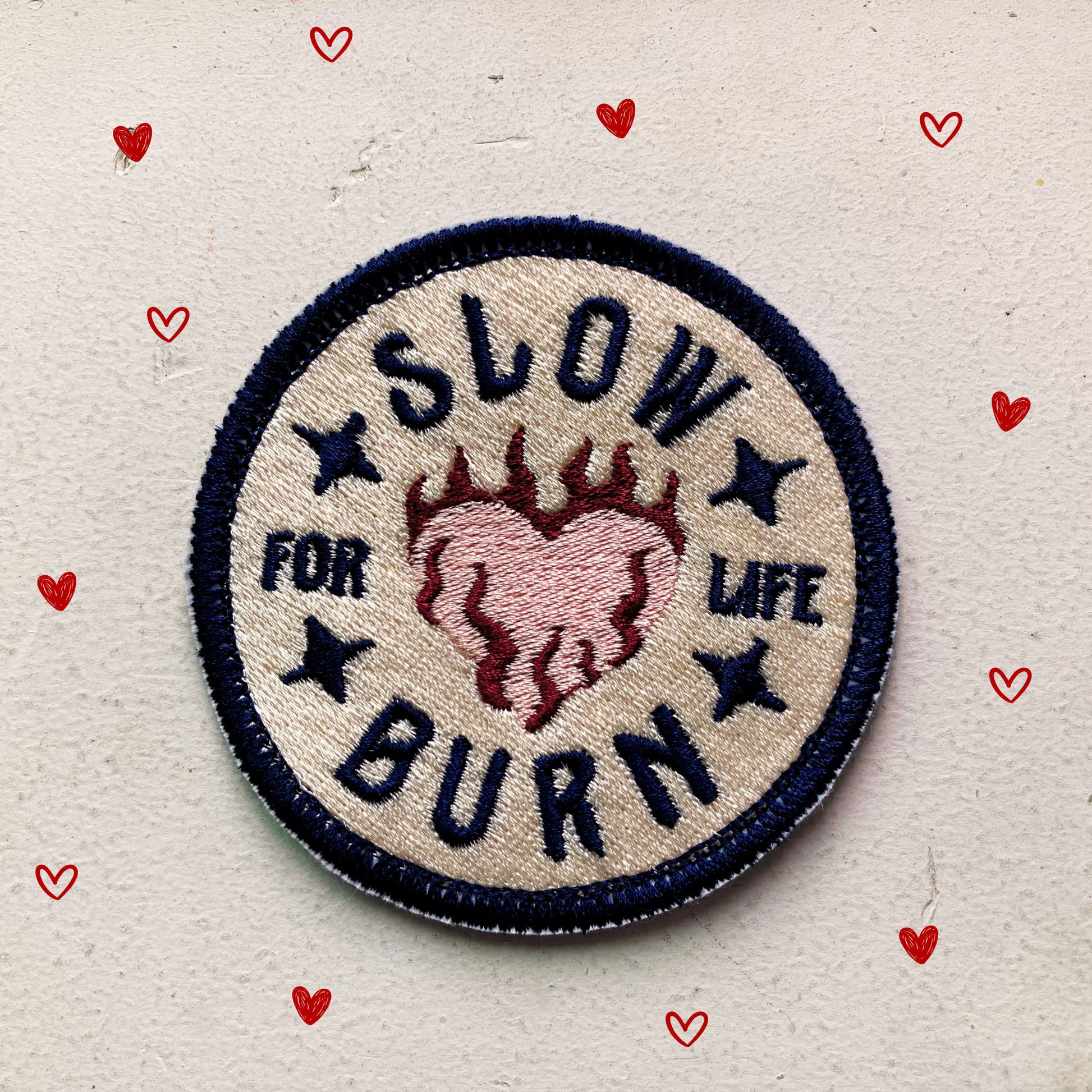 Celebrate your love for the slow burn romance with this fully embroidered patch. This patch is perfect for romance readers who live for the tension, longing, and payoff of a true slow burn story. This iron-on patch is built for durability—no fraying, no peeling, just clean edges and long-lasting wear.