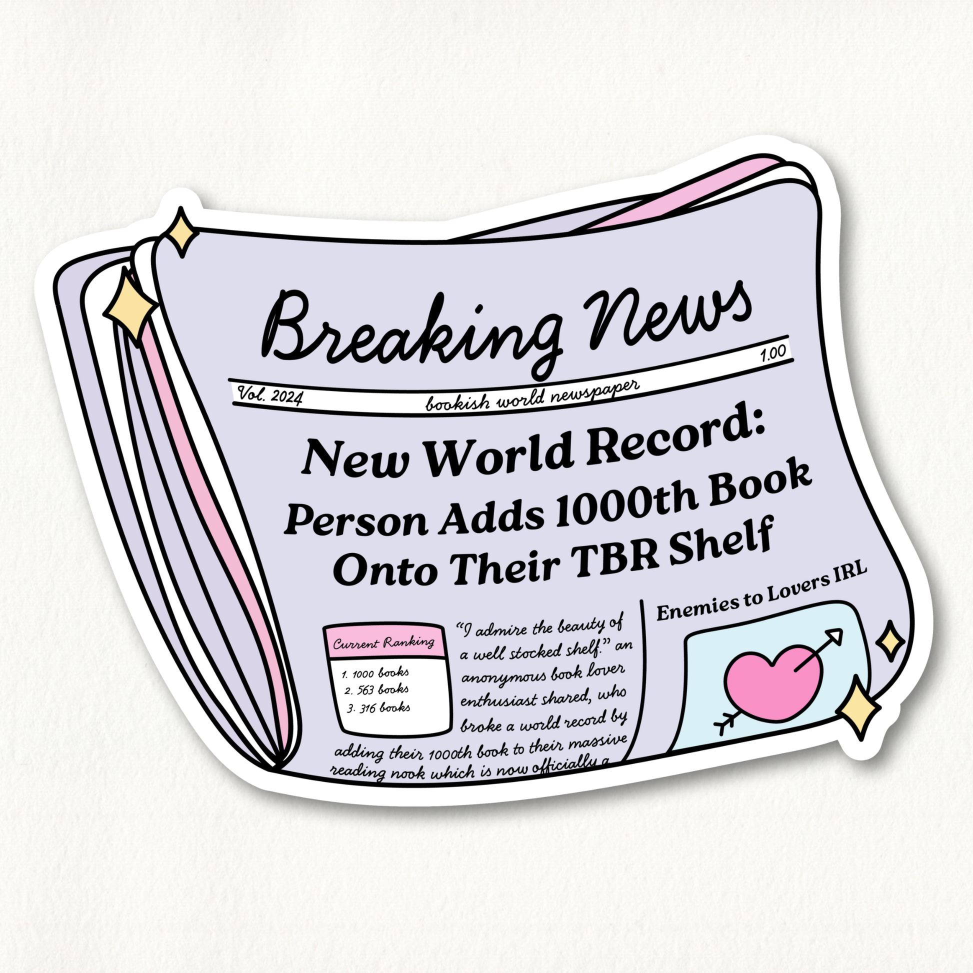 This glossy vinyl sticker is styled like a newspaper headline announcing: “New World Record: Person Adds 1000th Book Onto Their TBR Shelf.” A fun, satirical design for book lovers with never-ending reading lists. Complete with reader rankings, quotes, and a playful “Enemies to Lovers IRL” blurb.